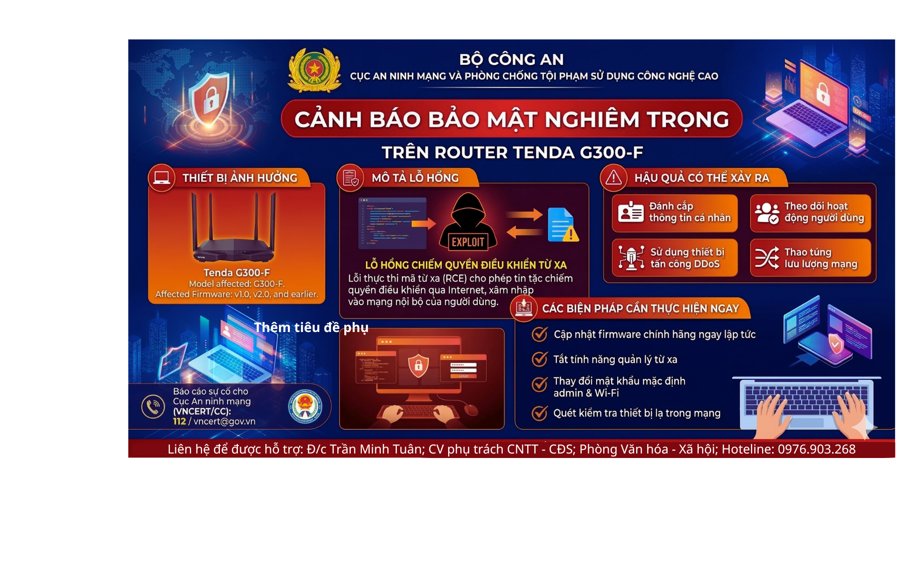 Để đảm bảo an toàn thông tin và tài sản, UBND xã [Tên xã của bạn] đề nghị người dân đang sử dụng thiết bị Tenda G300-F khẩn trương thực hiện các bước sau: